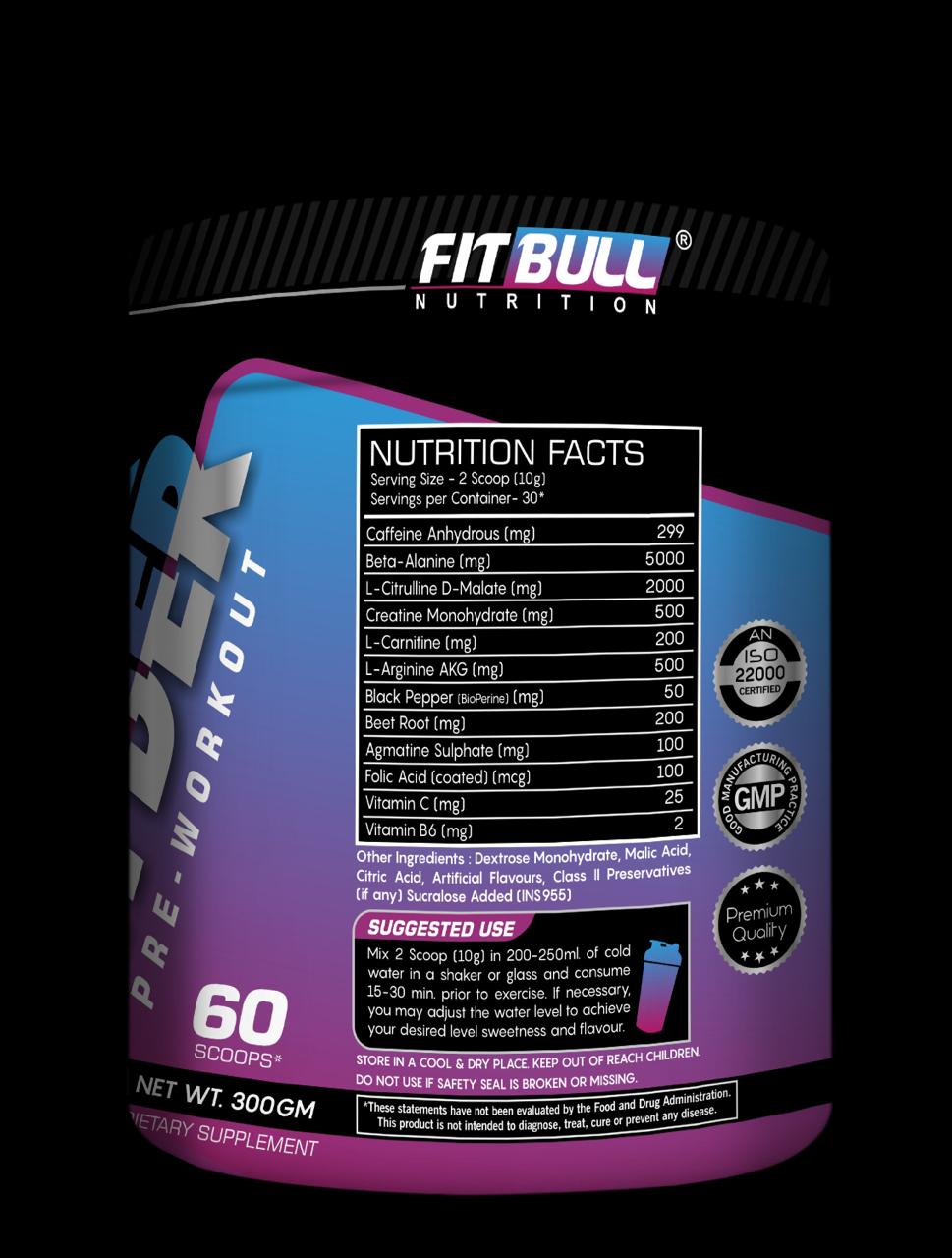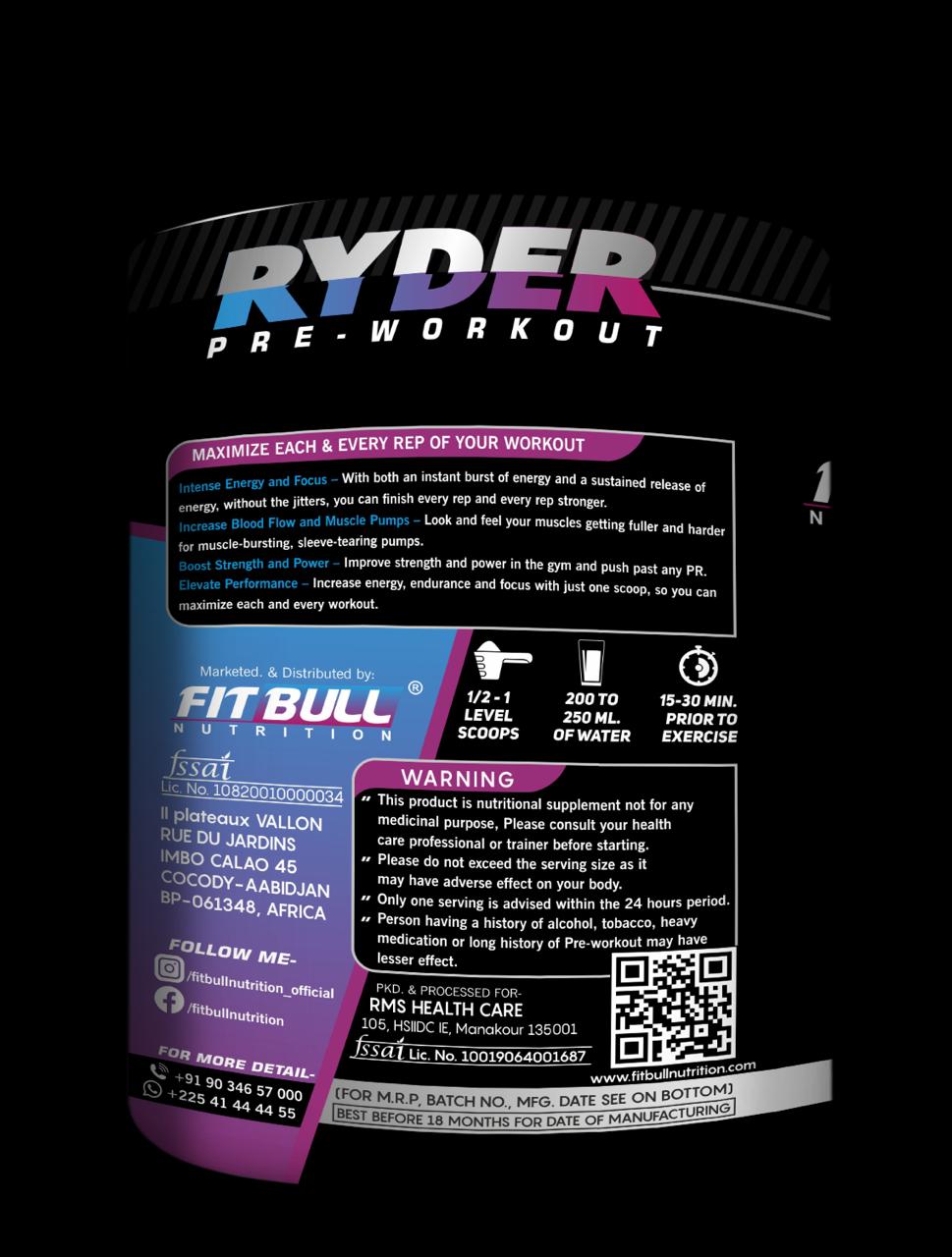Ryder Pre-workout Contains L-citrulline, arginine AAKG, beta-alanine, and creatine monohydrate for a well-rounded pre-workout experience. Offers improved energy levels, enhanced focus, and increased muscle endurance.