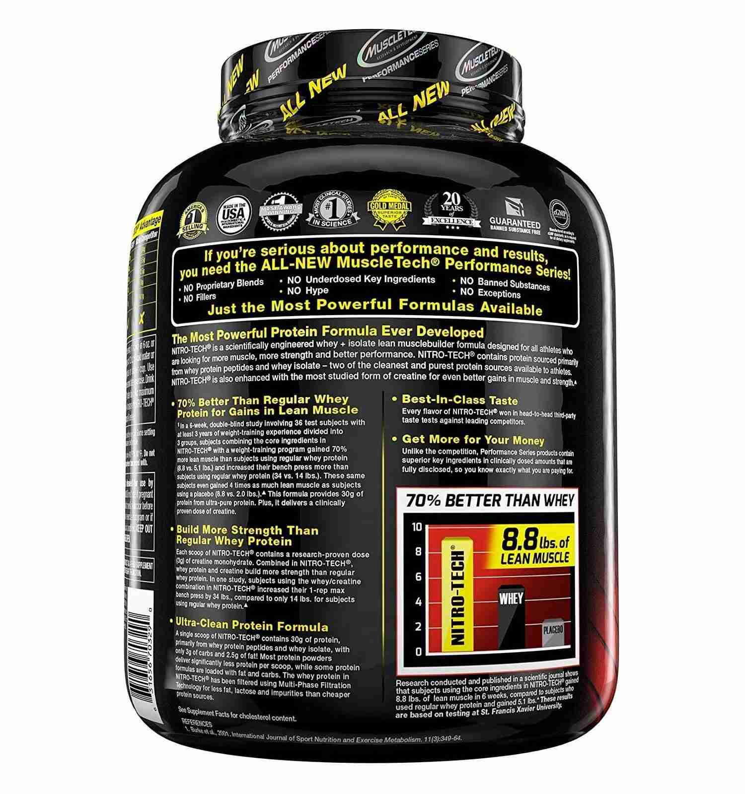 - PROTEIN POWDER for MUSCLE GAIN – In a 6-week, double-blind study involving the core ingredients of Nitro-Tech, subjects gained 70% more lean muscle than those using regular whey (8.8 vs 5.1 LBS) and increased their bench press more (34 vs 14 l